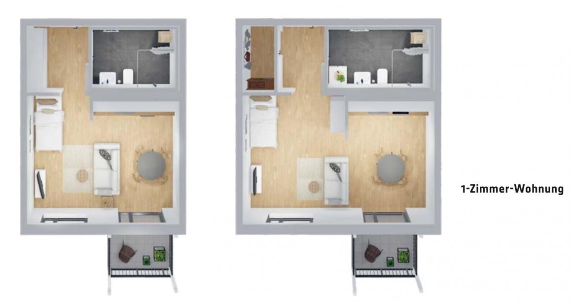 Die beiden 1-Zimmer-Wohnungen, die für das Bergstedt Wohnquartier geplant sind, zeichnen sich durch eine effiziente und durchdachte Raumaufteilung aus. Beide Grundrisse bieten einen kombinierten Wohn- und Schlafbereich, der nahtlos in einen kleinen Essbereich übergeht, sowie eine separate, funktionale Küche. Das Badezimmer ist kompakt und vom Eingangsbereich leicht zugänglich. Ein wesentlicher Vorteil dieser Wohnungen ist der direkte Zugang zu einem Balkon, der zusätzlichen Außenraum bietet. Die Variationen in der Möblierung und Anordnung der Räume ermöglichen Flexibilität und Anpassung an die Bedürfnisse der Bewohner, was im Bergstedt Wohnquartier ein komfortables und modernes Wohnumfeld schafft.