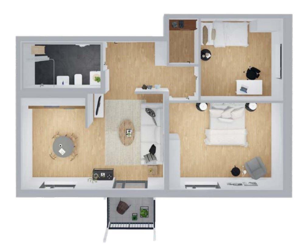 Der großzügige, barrierefreien Wohnbereich bietet direkten Zugang zum Balkon. Die Wohnung verfügt über ein geräumiges Hauptschlafzimmer, ein flexibel nutzbares zweites Schlafzimmer, eine funktionale, separate Küche und ein seniorengerechtes Badezimmer mit bodengleicher Dusche. Die durchdachte Raumaufteilung ermöglicht ein komfortables, sicheres und unabhängiges Leben.