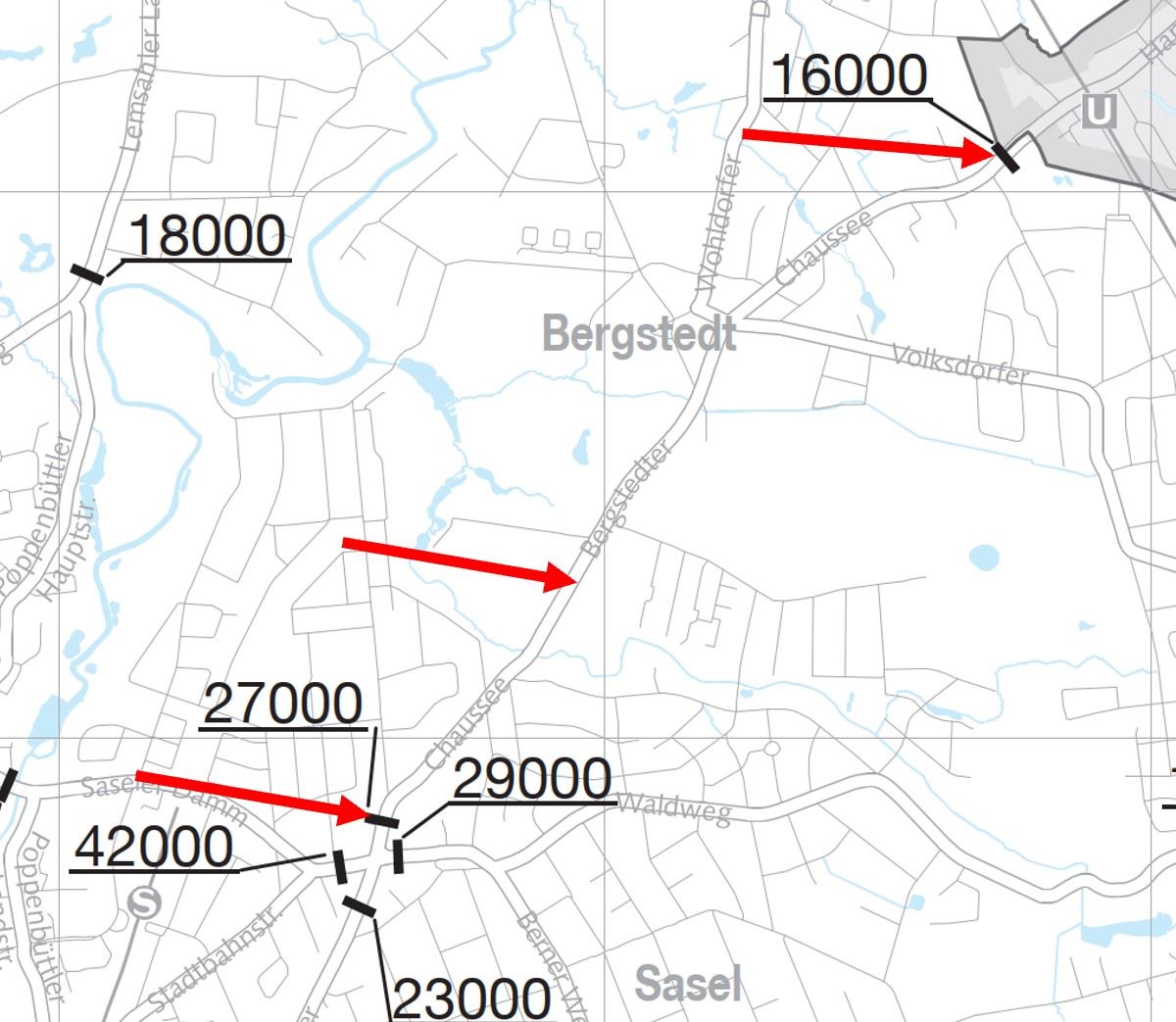 An dieser Kreuzung wird nochmals erheblicher Verkehr zugeführt, sodass an der nächsten großen Kreuzung Saseler Chaussee / Stadtbahnstraße bereits 27.000 KFZ pro Tag gezählt werden. Wir gehen daher davon aus, dass ca. 25.000 KFZ pro Tag die Bergstedter Chaussee 36 passieren.