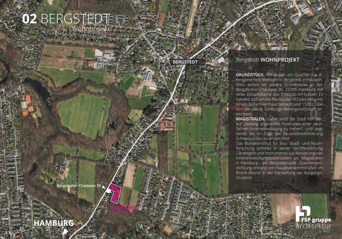 Wir wollen ein Quartier für altersgerechtes Wohnen in Bergstedt entwickeln. Dazu wollen wir unsere Grundstücke an der Bergstedter Chaussee 36, 22395 Hamburg mit einer Gesamtfläche von 7.542,00 m² nutzen. Es handelt sich um die Flurstücke 743 (derzeitig mit einem Einfamilienhaus bebaut) und 1535 (2004 von der SAGA Siedlungs-Aktiengesellschaft erworben).
