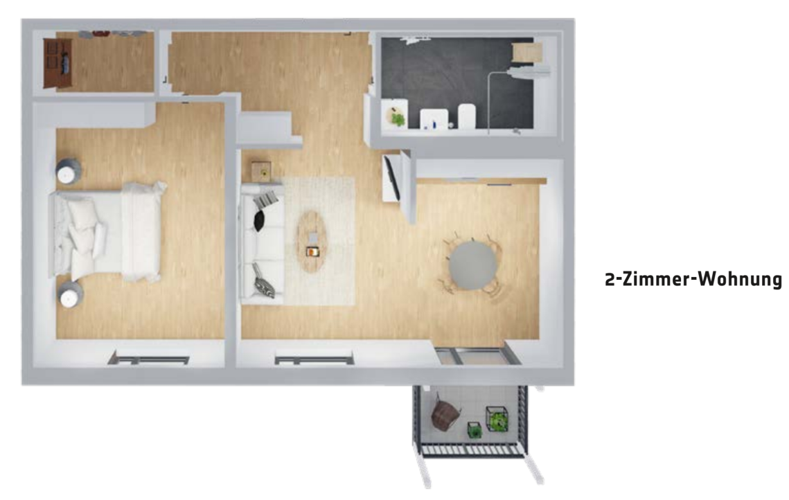 Die beiden 1-Zimmer-Wohnungen, die für das Bergstedt Wohnquartier geplant sind, zeichnen sich durch eine effiziente und durchdachte Raumaufteilung aus. Beide Grundrisse bieten einen kombinierten Wohn- und Schlafbereich, der nahtlos in einen kleinen Essbereich übergeht, sowie eine separate, funktionale Küche. Das Badezimmer ist kompakt und vom Eingangsbereich leicht zugänglich. Ein wesentlicher Vorteil dieser Wohnungen ist der direkte Zugang zu einem Balkon, der zusätzlichen Außenraum bietet. Die Variationen in der Möblierung und Anordnung der Räume ermöglichen Flexibilität und Anpassung an die Bedürfnisse der Bewohner, was im Bergstedt Wohnquartier ein komfortables und modernes Wohnumfeld schafft.